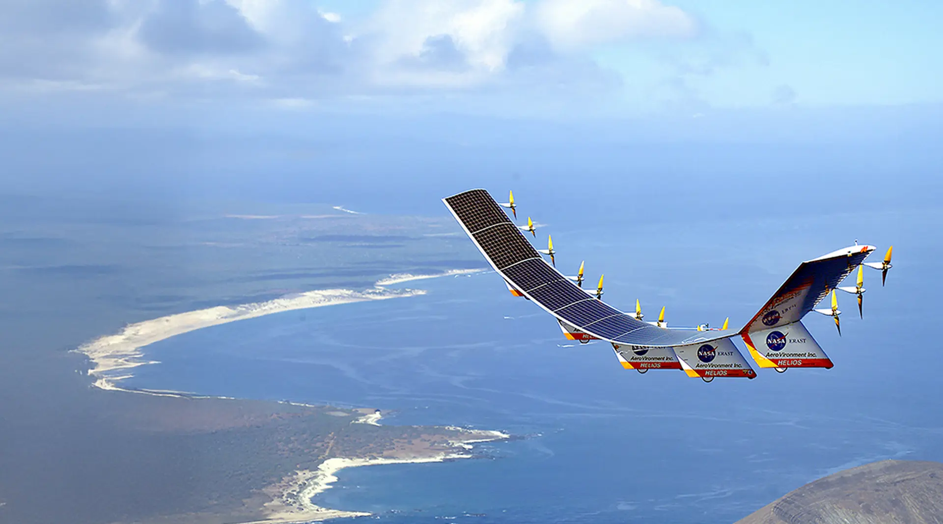 Helios was a remotely piloted, solar-electric flying wing with a 247-foot wingspan—longer than a Boeing 747’s. On August 13, 2001, it reached 96,863 feet, a world record for sustained horizontal flight by a winged aircraft. Helios carried roughly 65,000 high-efficiency SunPower solar cells capable of producing over 35 kW under peak sun.